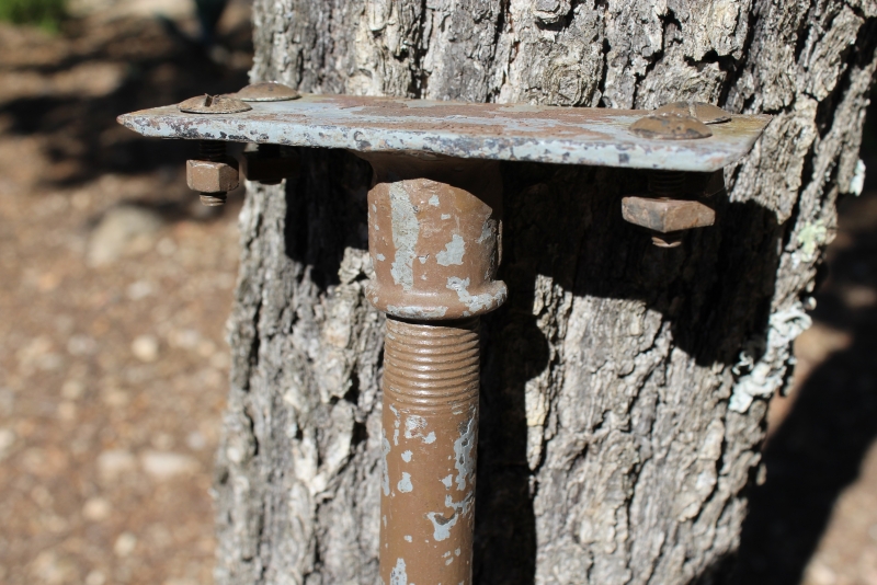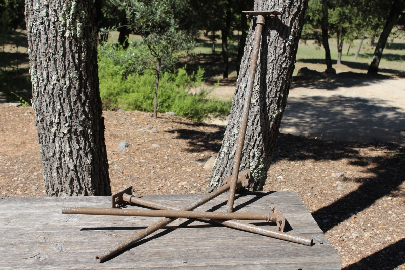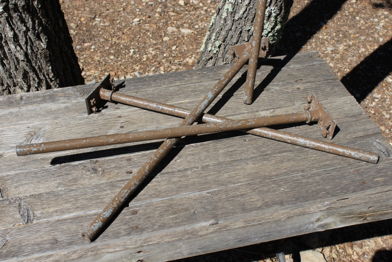 De poten zijn uitgevoerd in grijs staal, ooit geschilderd in bruin en nu gedeeltelijk weer wat afgebladderd.