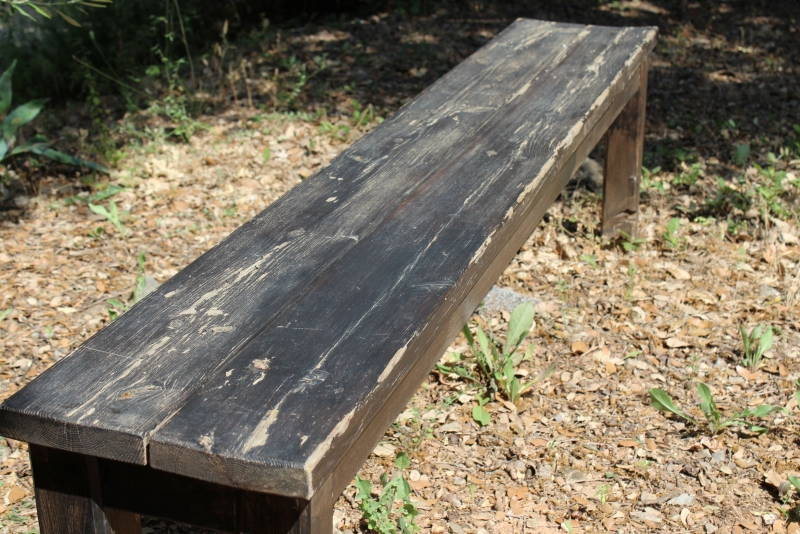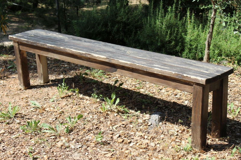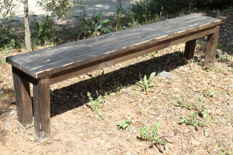 Lange en zeer stevige houten bank, uitgevoerd in een hoekig model.