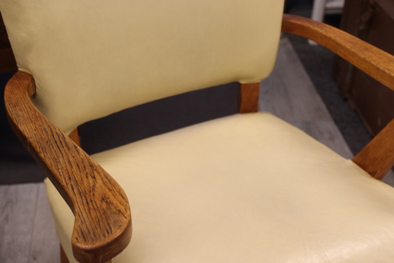 Gemaakt uit eikenhout, een zitting met nog springveren en bekleed met wit leer.