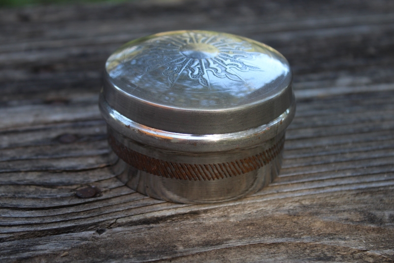 Voorzien van gehamerde en gedreven decoratie, met op de deksel een gestileerde zon.