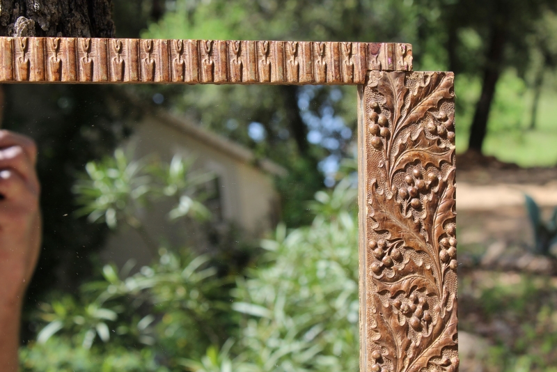 Aparte spiegel met een rijk gedecoreerde houten lijst.