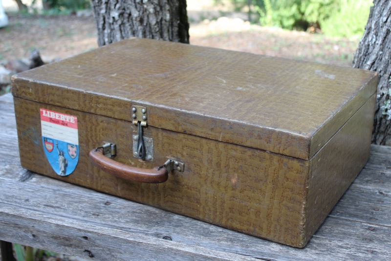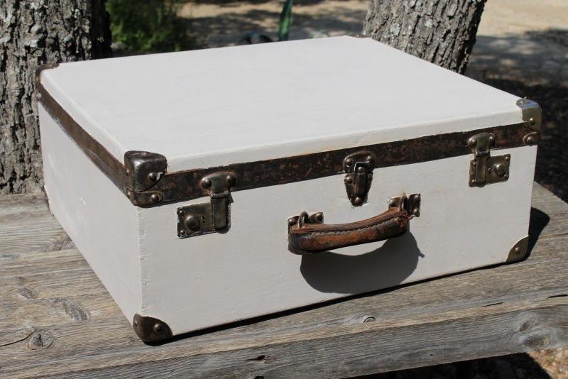 Grote oude houten koffer, geschilderd in grijs-beige.
