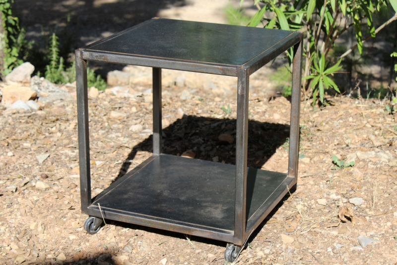 Handgemaakt exemplaar, vervaardigd uit een stalen buisframe, met 2 plateau's van plaatstaal, uitgevoerd in heel donkergrijs.