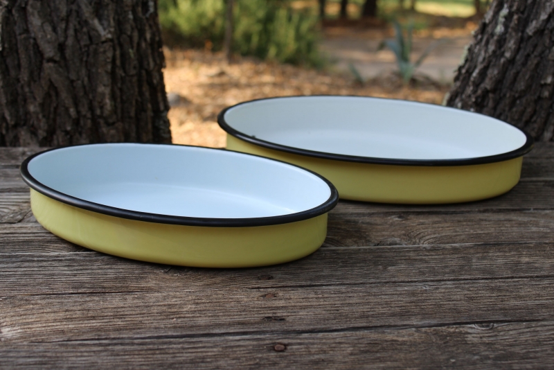 Set van 2 lage, oude ovale ovenschalen, in verschillende maat.