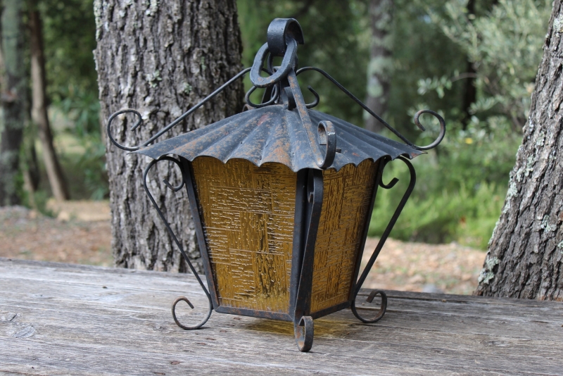 Apart model buitenlamp, gemaakt uit zwart/grijs metaal, gedecoreerd met Franse lelies en afgedekt met een zogenaamde heksenhoed.