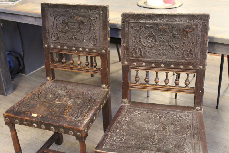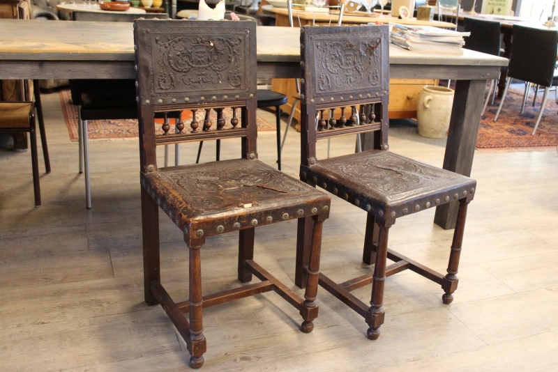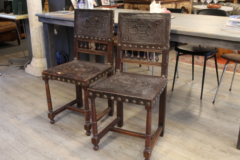 Gemaakt uit eikenhout, met klassieke vormgeving en de zitting en rugleuning uitgevoerd in leer, voorzien van een geperste decoratie in Barok-stijl.