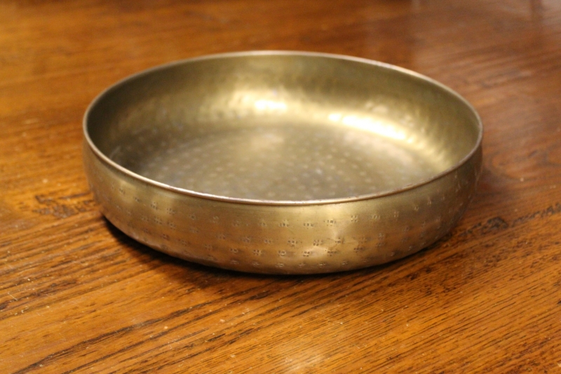 Het betreft een oude verkoperde metalen schaal, rondom bewerkt met gehamerde decoratie.
