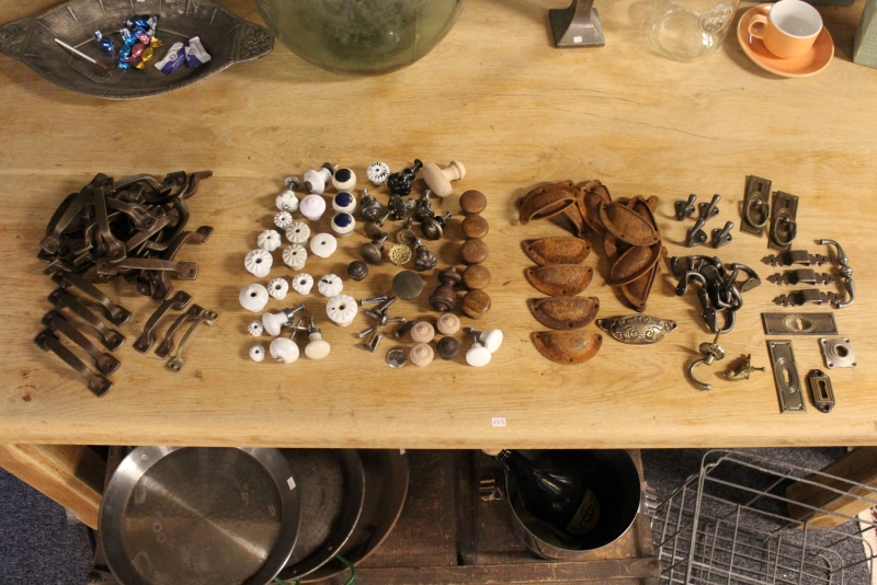 Hele partij met handgrepen / meubelgrepen, knoppen, ophanghaakjes en diverse meubelbeslag en onderdelen: