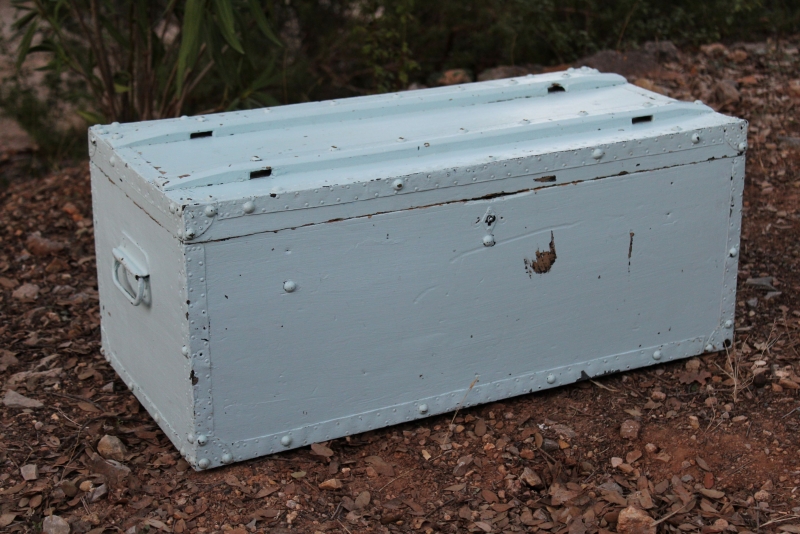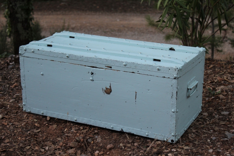 Deze fijne kist heeft meerdere kleuren gehad en is voor het laatst overgeschilderd in heel lichtblauw.