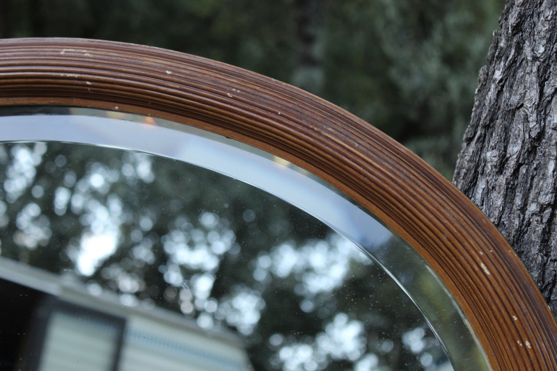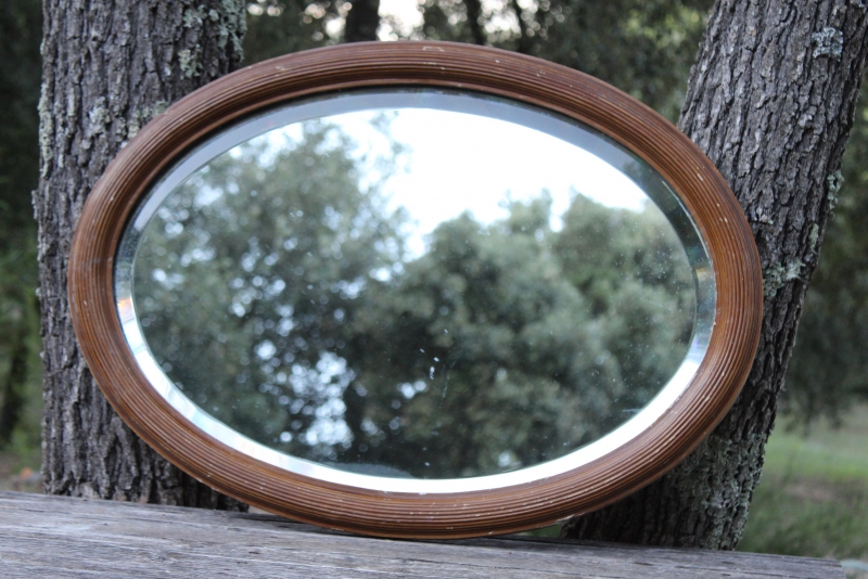 Forse ovale oude spiegel met een dikke houten lijst, bruin van kleur en met een geribbelde rand.