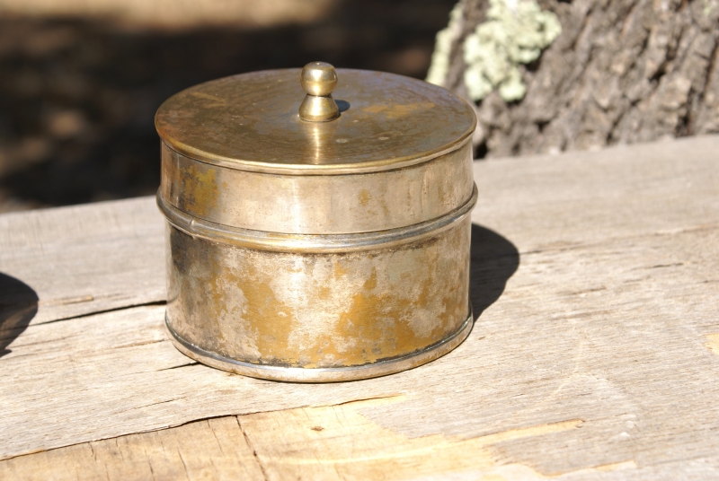 Voorzien van gehamerde en gedreven decoratie, met op de deksel een gestileerde zon.