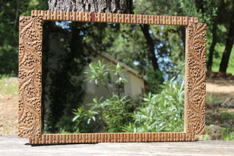 Aparte spiegel met een rijk gedecoreerde houten lijst.
