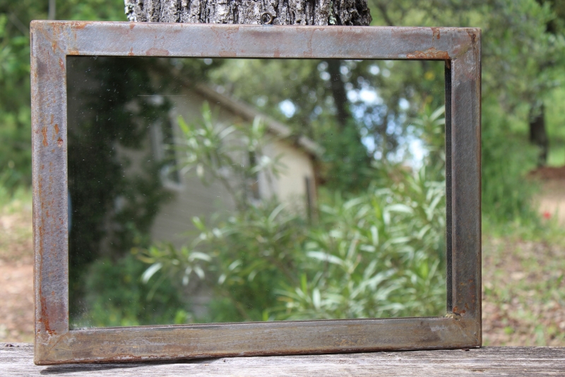 Oude rechthoekige spiegel, gevat in een stoere stalen omlijsting.
