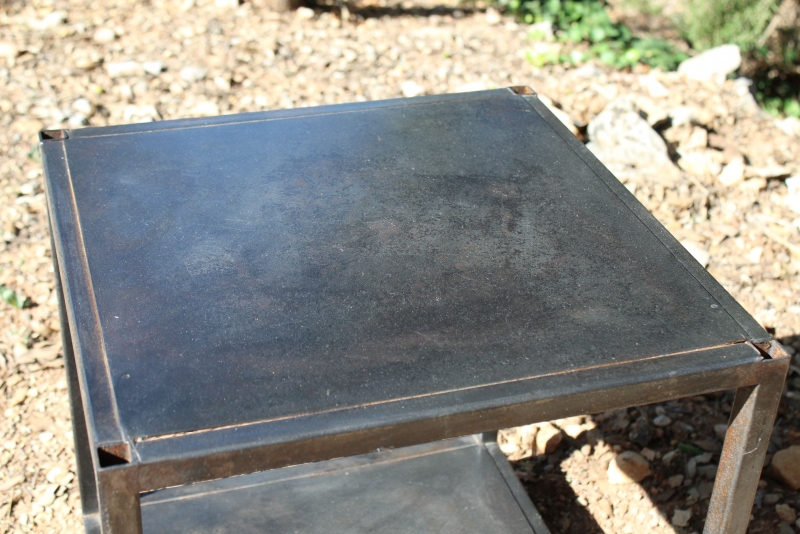 Handgemaakt exemplaar, vervaardigd uit een stalen buisframe, met 2 plateau's van plaatstaal, uitgevoerd in heel donkergrijs.