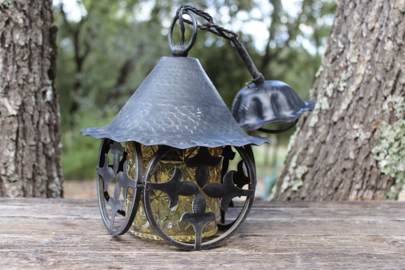 Apart model buitenlamp, gemaakt uit zwart/grijs metaal, gedecoreerd met Franse lelies en afgedekt met een zogenaamde heksenhoed.