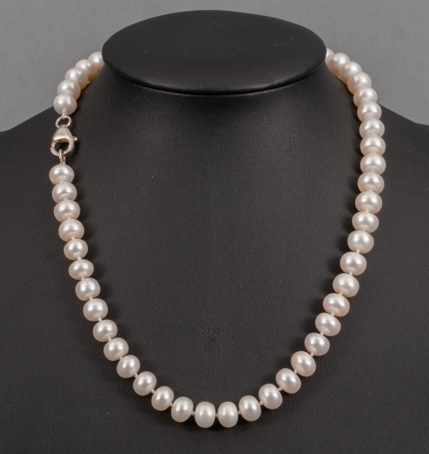 Kort en chique collier met dikke, ovale Barokparels in helder wit.